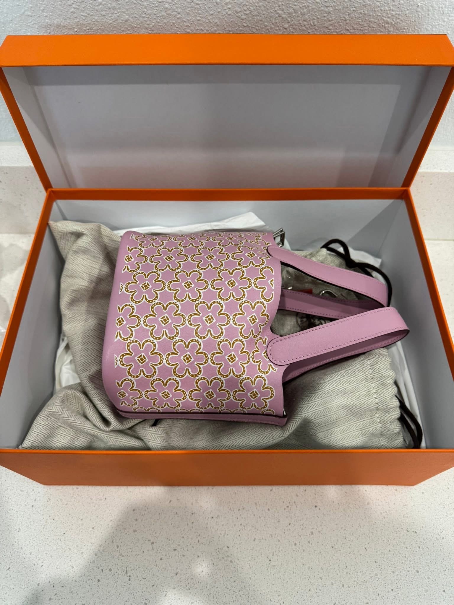Elevate your collection with this stunning Hermès Picotin Micro in a limited-edition mauve floral motif, crafted in luxurious leather with palladium hardware. This is a rare find — especially in this colorway and size.